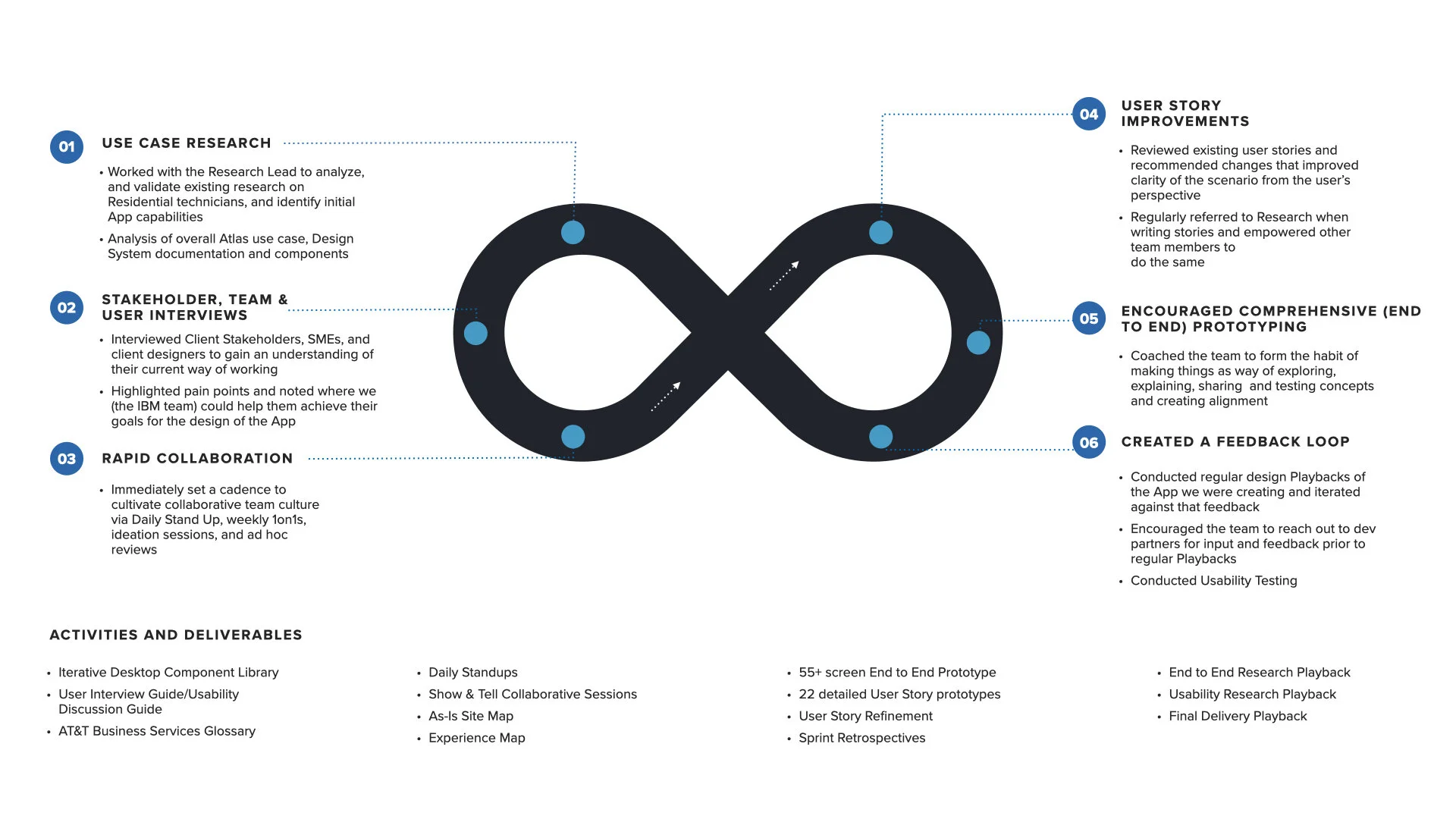 We expected to build something new, but the actual scope was different: join AT&T's newly formed design team to work through a backlog of vague, technically complex user stories using their existing mobile app (Atlas) and design system, both originally built for residential technicians.