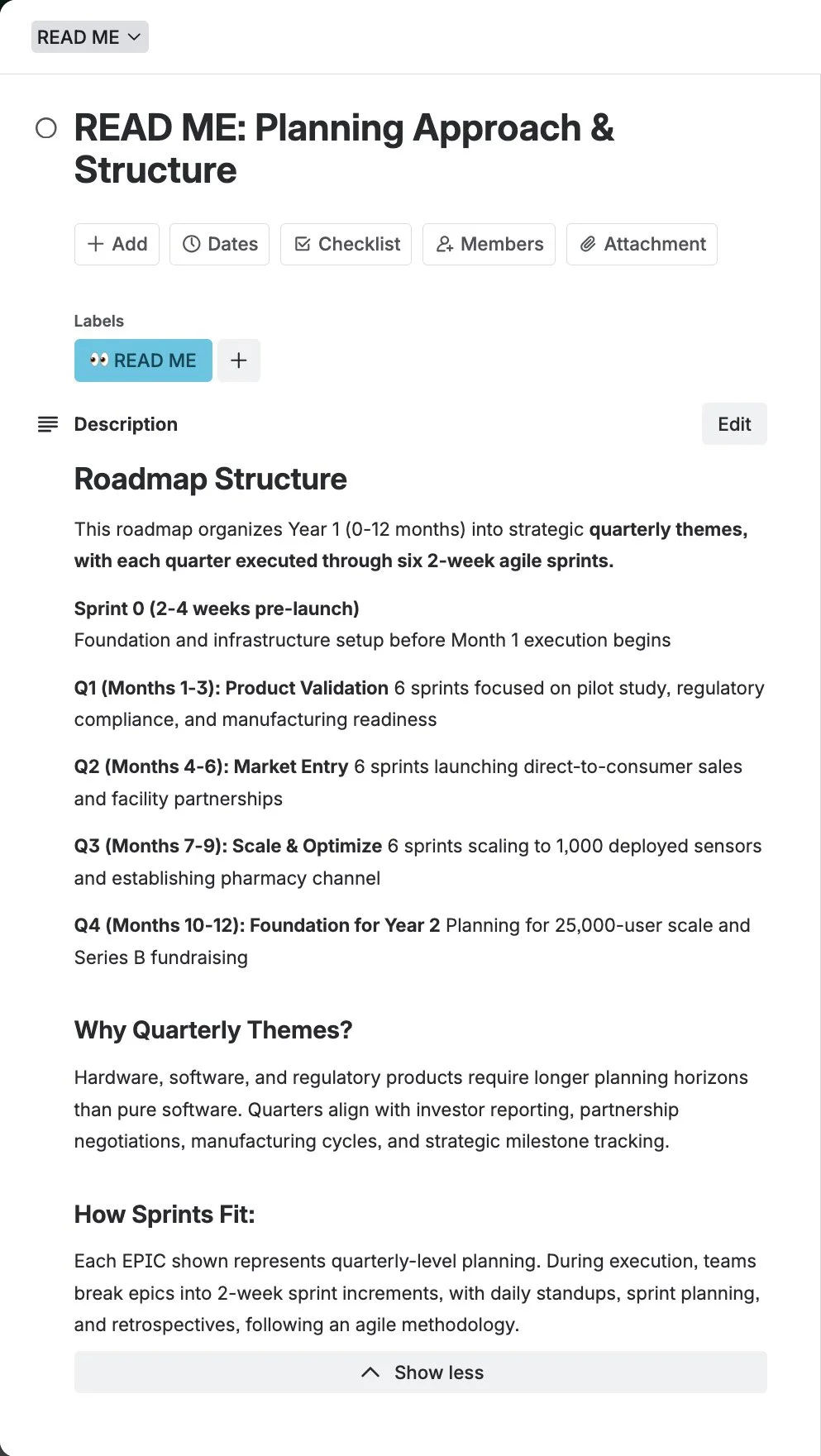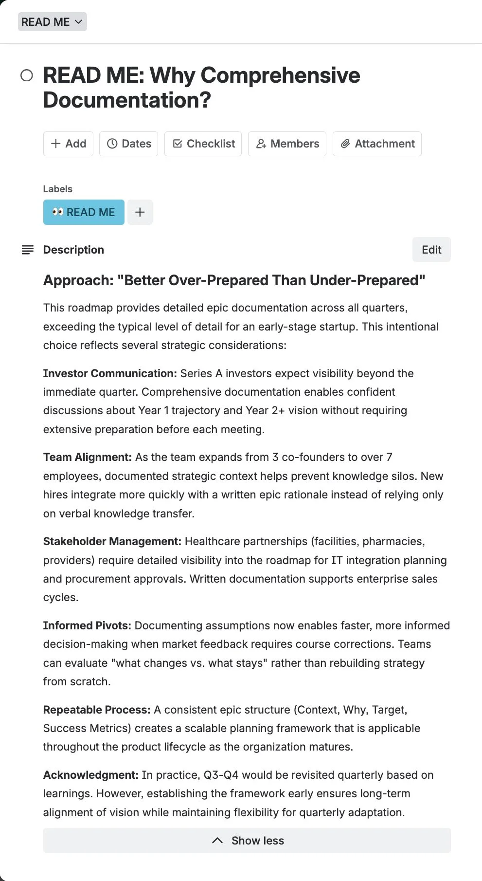 Each READ ME card explains how the roadmap works, why decisions were made, and how to use the labeling system—so a growing team can onboard without tribal knowledge.