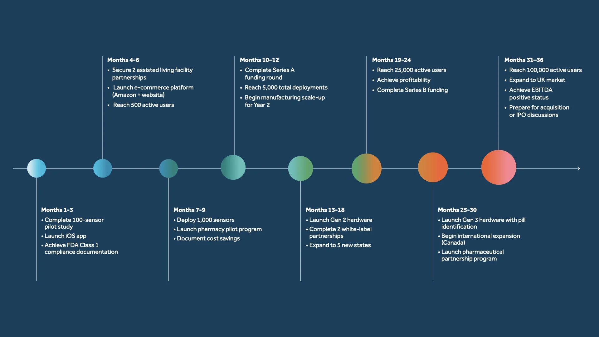 Achieve product-market fit through a 100-sensor pilot. Target adult children caring for elderly parents. $29.99 sensor + $4.99/month subscription.