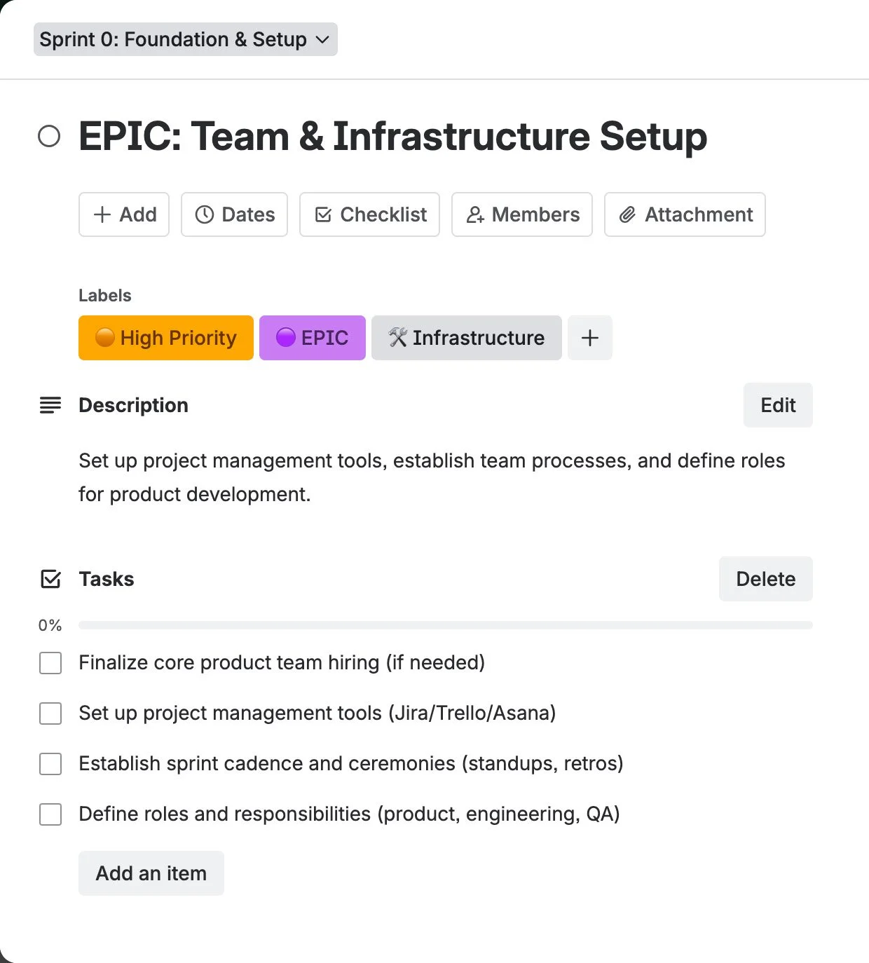 I built a working product roadmap in Trello—Sprint 0 through Q3, with detailed epics for FDA Class 1 compliance, iOS app launch, e-commerce platform, caregiver dashboard, and HIPAA implementation.