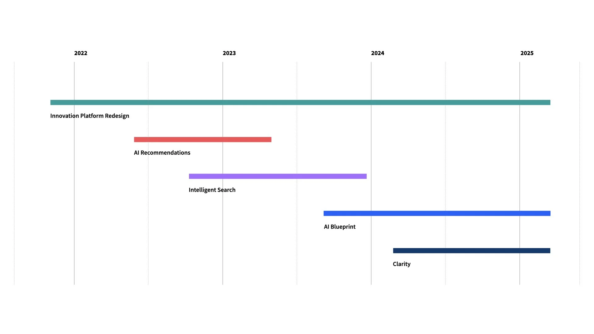 At the same time, AI capabilities were kept small (Recommendations), scaled to critical needs (Intelligent Search), orchestrated across the platform (AI Blueprint), and unified under one brand (Clarity).